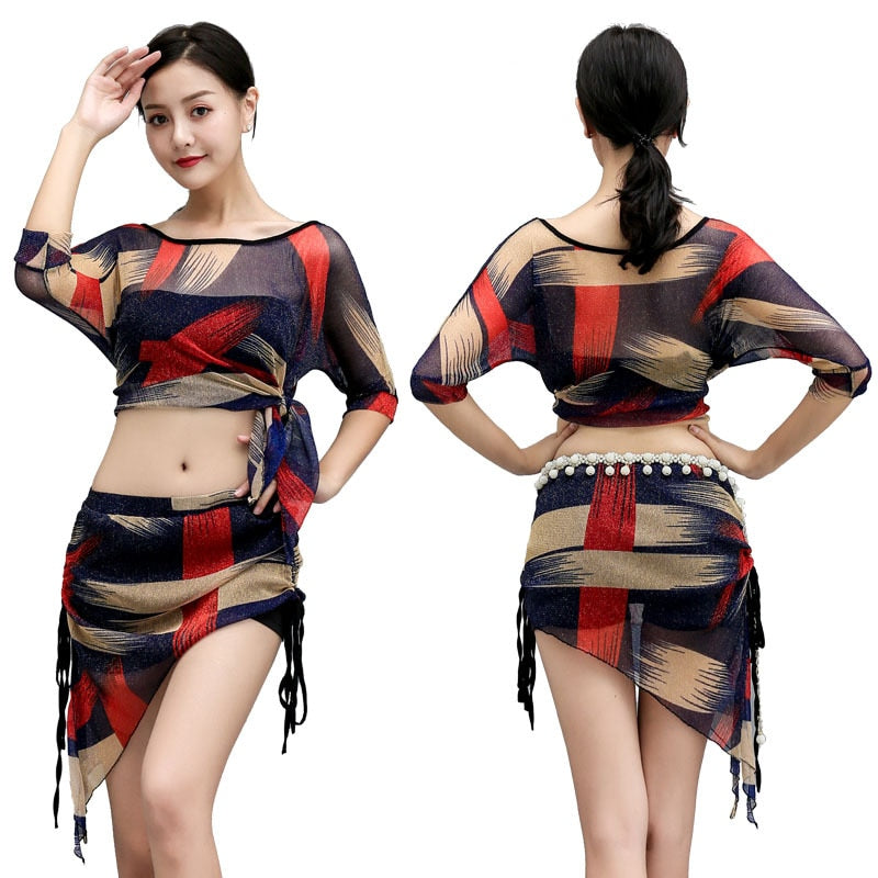 Oriental Bellydance Practice Clothing For Women Net Yarn Belly Dance Costume Top And Hip Scarf Sexy Training Suit Dancewear
