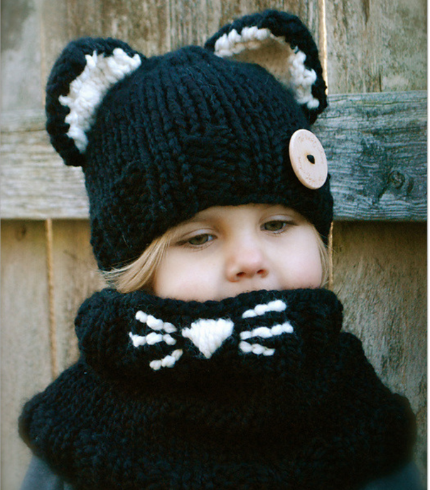 Knit hat children's animal cat ears set hat hand-knitted warm neck bonnet
