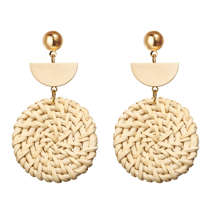 Woven Round Wooden Earrings Wish Straw Woven Beige Earrings