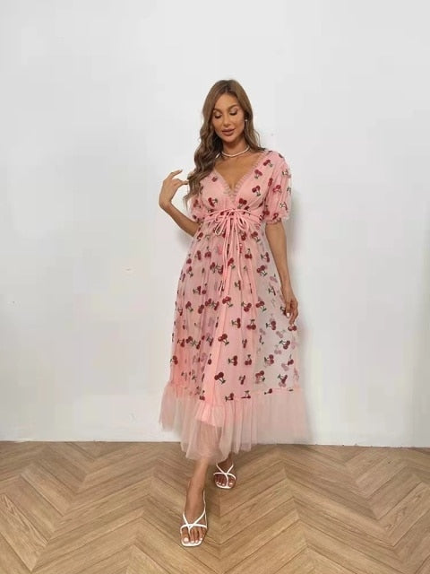 Item Name: Summer Sweet Sequins Needlework Strawberry Deep V French Dress