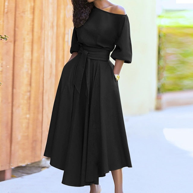 Women Elegant Sexy Off Shoulder Party Dress 2021 Summer Tie-Up A-Line Dress Office Lady Casual Short Sleeve Pocket Dress Vestido