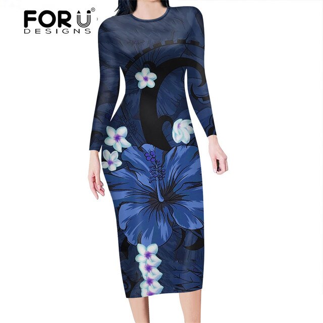 FORUDESIGNS Fashion Autumn Women Slim Pencil Dress Polynesian Hawaii Hibiscus Purple Plus Size Midi Bodycon Dresses for Female
