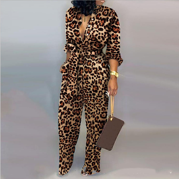 Printed Leopard Print Long Sleeve Jumpsuit