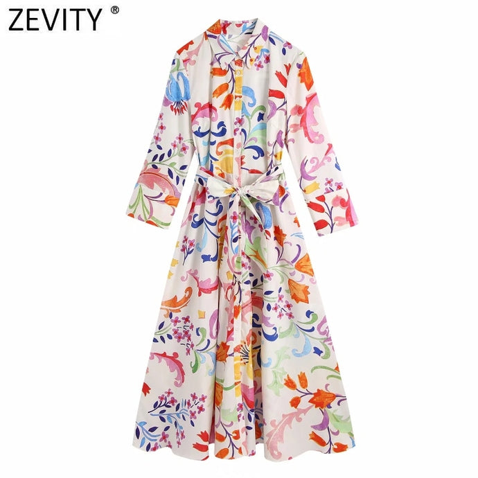 Zevity Women Vintage Totem Floral Print Bow Sashes Midi Shirt Dress Female Chic Three Quarter Sleeve Casual Slim Vestidos DS8361