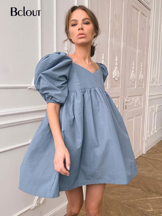 Bclout Vintage Blue Black A-Line Mini Dress Woman 2021 Summer Loose Sexy Patchwork Party Dress V Neck Half Sleeve Party Vestido