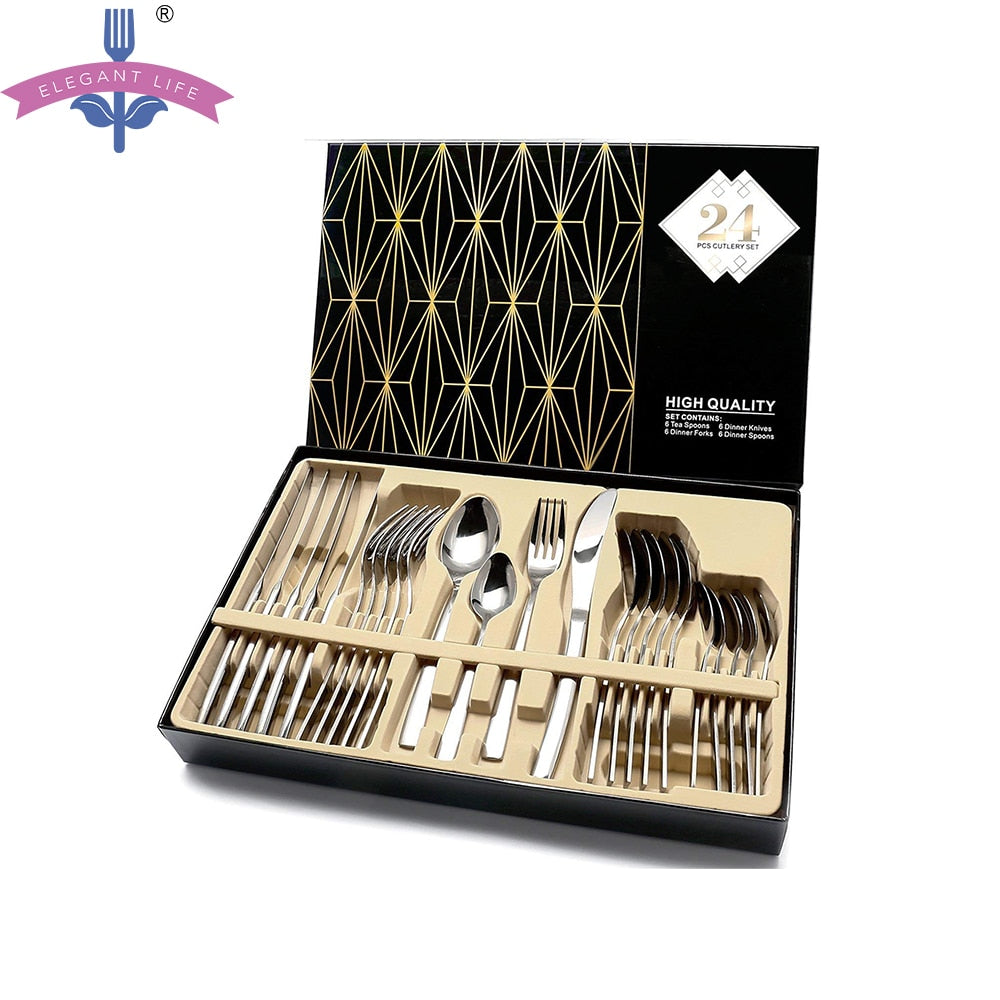 24 PCS Stainless Cutlery Set Flatware Sets High-Grade Mirror Polishing 18/10 Silverware Dinnerware Spoons Knife Fork Gift Box